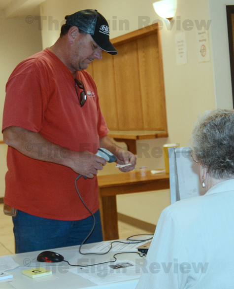 Donations are being accepted today at the Elgin KC Hall until 5 pm — walkins always welcome! Pictured: Elgin’s Ron Scholl takes time to check in and donate blood this morning. E-R photo