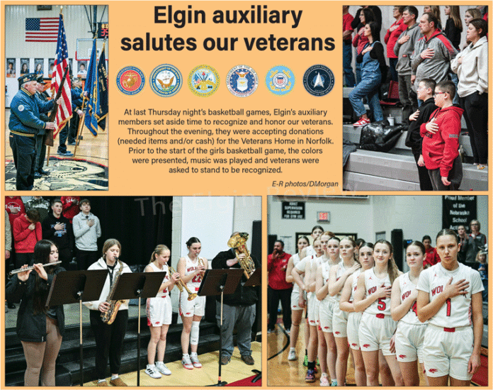 At last Thursday night’s basketball games, Elgin’s auxiliary members set aside time to recognize and honor our veterans. Throughout the evening, they were accepting donations (needed items and/or cash) for the Veterans Home in Norfolk. Prior to the start of the girls game, the colors were presented, music was played and veterans were asked to stand to be recognized.