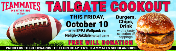 As part of the buildup for the Wolfpack versus Neligh/Oakdale football game, Elgin TeamMate board members and mentors will be serving burgers and chips beginning at 5 p.m. and continuing throughout the evening until food runs out.