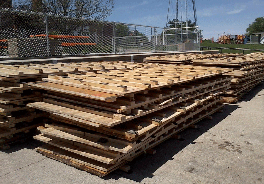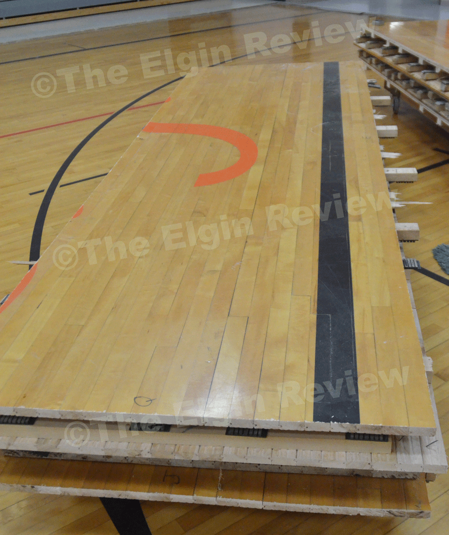 Over the course of the past week, both students and adults have been working hard to remove the old wooden floor in the Elgin Public School gymnasium. Year’s of wear and sanding had put the floor on its “last leg” and the decision was made by the school board to replace the flooring earlier this year. The school board was approached by Jeff and Randy Scholl about the old floor. The duo offered to remove the floor for free. The company providing the new flooring had quoted the school a cost of $6,500 for removing the old floor. In return for doing the removal and saving the school district money, the Scholls were given the old wood floor. They have several things that the old floor will likely be used for – including possibly selling portions of the floor. Following cleanup of debris, prepping the area and installation on the new floor will begin.