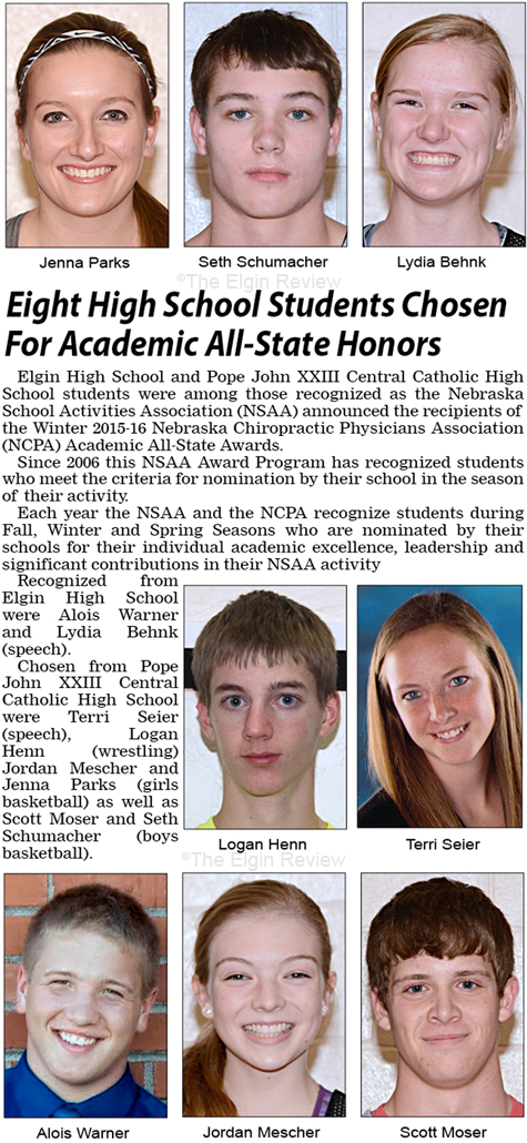 Elgin/PJCC Academic All-State Jenna Parks, Seth Schumacher, Lydia Behnk, Logan Henn, Terri Seier, Alois Warner, Jordan Mescher and Scott Moser.Elgin, Nebraska Elgin Review