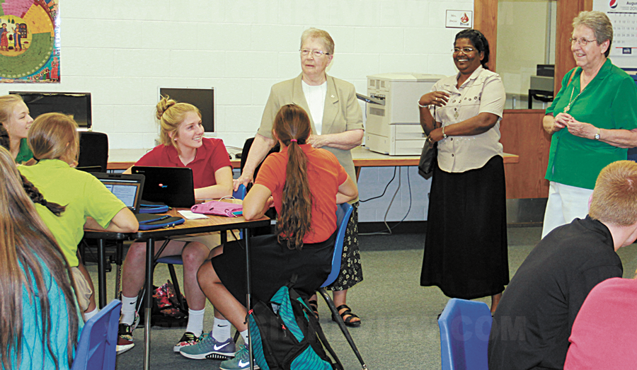 Sister Mary and her fellow Leadership Team Member, Sister Francitta Pazhukkathara, received a tour of the school. “Bringing in St. Boniface School is such a good use of the building and is a good connection to make between high school students and the elementary students,” stated Sister Mary. She was also impressed with the condition of the facilities, “It has really been kept up nice and updated, ” she commented. When asked for her final thoughts about Pope John High School, she said, ” There is such a strong spirit in this school, it was that way when I served here and it is still here today.” After taking a brief stop back home in Milwaukee, Sister Mary is headed to visit a SSSF province in India.