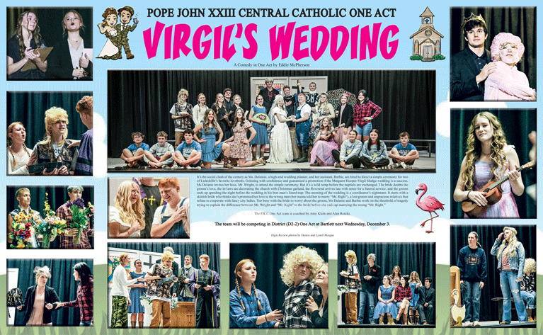 There was nary an empty seat Sunday night at St. Boniface Auditorium for the school’s dinner theatre performance of ‘Virgil’s Wedding.’ Shown here in a scene is bride Brooke Kinney, groom Aiden Klein and Raaf Klein, minister. Earlier in the week, Pope John students earned acting awards at the NVC competition. They were Camry Kittelson, Aiden Klein, Matthew Kerkman, Reese Stuhr, Tessa Barlow, Brooke Kinney and Kinley Drueke. Their next performance will be next week at the District One-Act competition to be held at Wheeler Central High School. More photos on the one act play can be found on Page Six.
