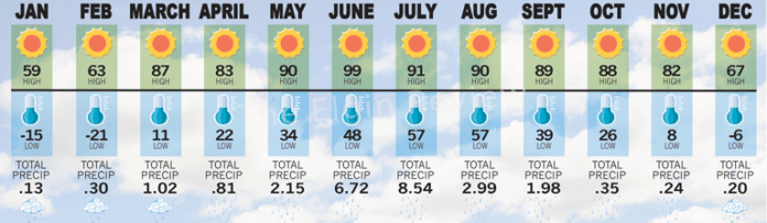 Measurable precipitation fell on 10 days in June. The most coming on June 26 when 2.35 inches of rain was recorded. For the month, 6.72 inches of rain fell. The figure was 2.72 inches above normal. The hottest day of the year occurred on June 22 when the temperature reached 99 degrees. The low was 48 degrees on June 4.